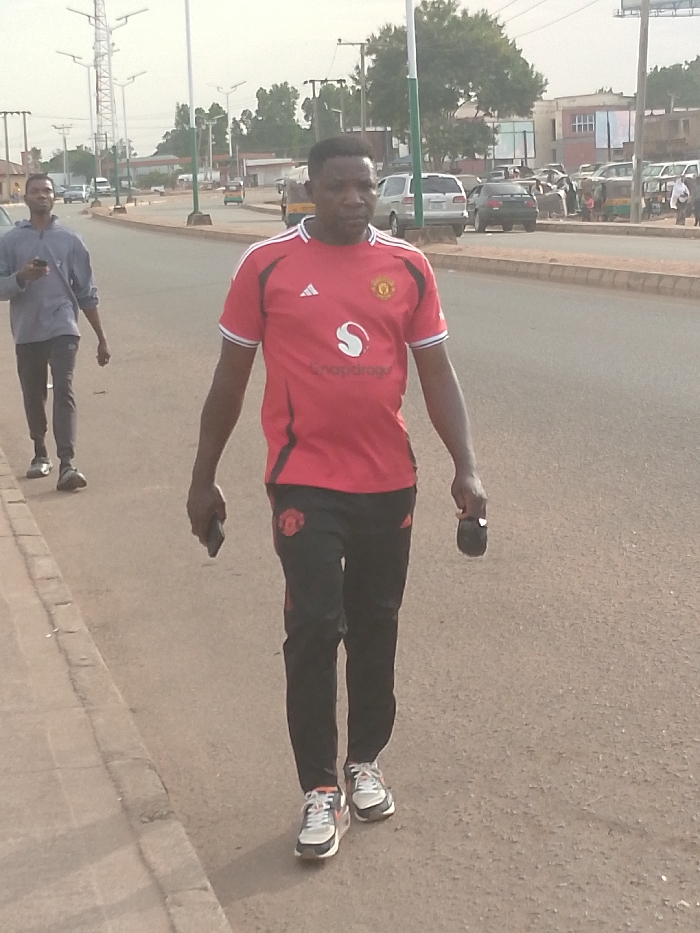 A man wearing a red soccer jersey and black pants walks along a road. The jersey features the Manchester United logo. He holds a cell phone and another dark object in his hands. Another man in a grey jacket and pants walks behind him. The scene appears to be a street with cars and buildings in the background under a slightly overcast sky.