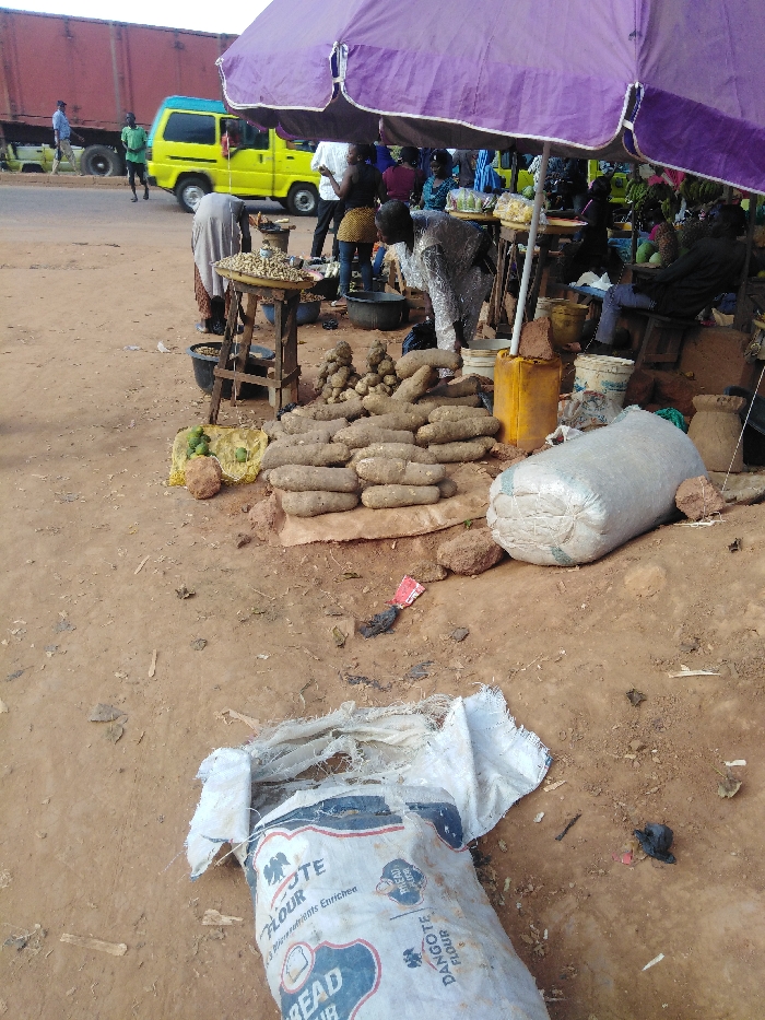 The image depicts an outdoor market scene in Yelwa, Nigeria. The foreground shows a reddish-brown dirt ground with an empty, torn white sack labeled "DANGOTE FLOUR" and "BREAD FLOUR" at the bottom right. Scattered pieces of refuse, including a red wrapper, are visible on the ground. In the mid-ground, a market stall is set up under a large, purple umbrella. To the left, a person wearing a light-colored head covering is bent over a wooden stand displaying numerous small, oval-shaped items, possibly groundnuts. Below the stand is a black bucket. Directly in front of the stall, a large quantity of yams or similar tubers is arranged on a piece of fabric on the ground. Behind these, several smaller piles of rounder tubers are present. To the left of the tubers, a yellow mesh bag holds several green, spherical fruits, accompanied by reddish-brown rocks. To the right of the tubers, a yellow plastic jerrycan and a white plastic bucket are visible. A large, grey/white sack lies horizontally on the ground to the right of the tubers. Under the purple umbrella, several individuals are present. One person is seated to the far right, and others are standing, appearing to be engaged in market transactions. In the background, a paved road is visible with vehicular traffic. A yellow van or minibus is partially obscured by people and the market stall. Further back, a large red truck is also present on the road. Two individuals are seen walking on the road to the left of the yellow van.