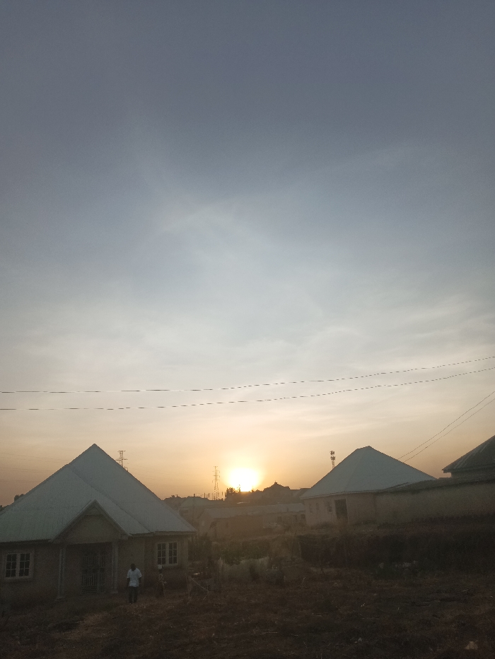 The image captures a residential area in Jos, Nigeria, during golden hour, likely sunset