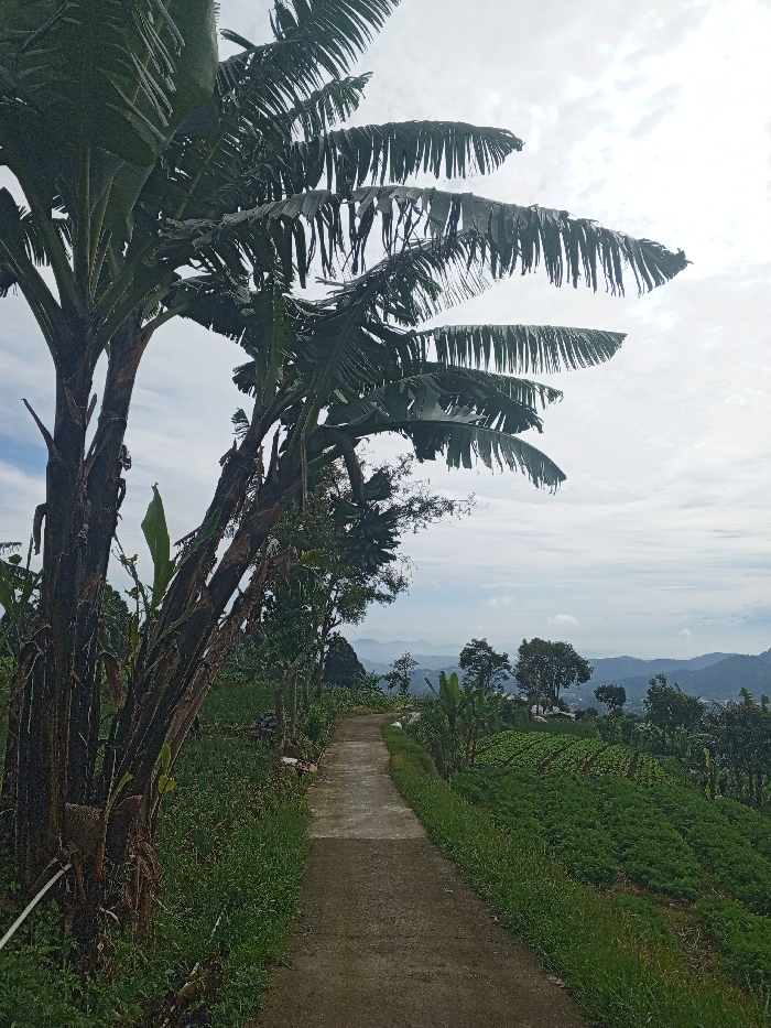 A narrow concrete path stretches into the distance, lined with lush greenery. Banana trees with large, drooping leaves dominate the left side of the path. A cultivated field of low-lying crops fills the right side. Distant mountains are visible under a cloudy sky, suggesting a high-altitude location. The scene portrays a rural pathway through a cultivated landscape.