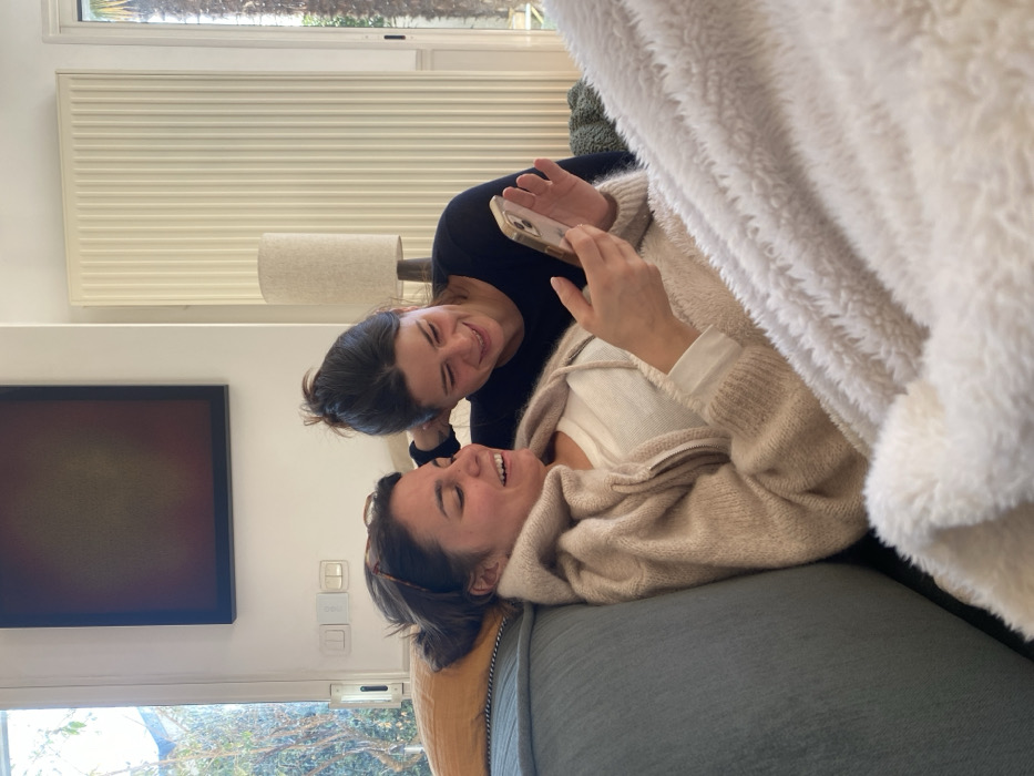 The image displays two adult females inside a residential setting in Rueil-Malmaison, France. One female, with dark hair and wearing a beige hooded cardigan over a white top, reclines on a light blue-green sofa, partially covered by a white fluffy blanket. She holds a smartphone with a clear case in both hands, actively viewing its screen. An orange-brown pillow is positioned behind her head. The second female, with dark hair tied up and wearing a dark long-sleeved top, leans over from behind the first, also fixated on the smartphone screen. Both individuals are smiling with open mouths, indicating shared amusement. The background features a white wall with a framed, dark-bordered abstract artwork displaying a reddish-brown, textured pattern. Below the artwork are two white electrical switches or outlets. To the right, a tall, white fluted radiator is visible next to a partially obscured floor lamp with a beige fabric shade. Large windows or glass doors are present on both the far left and right. The left window reveals lush green foliage outdoors, while the right window shows the trunk of a palm tree. The room is brightly lit, consistent with natural daylight.