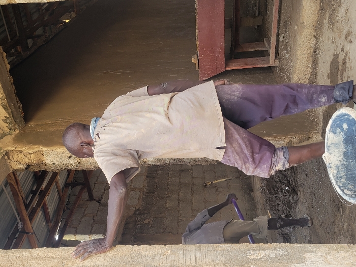 Two men work on a construction project. One man stands on a concrete ledge, leaning forward. He wears a light-colored short-sleeved shirt and dark pants. A blue bucket sits beside him. Below, another man uses a purple tool, possibly a hoe, near the dirt and a concrete wall. The setting seems to be an open-air structure under construction, with glimpses of wooden beams and corrugated metal roofing.