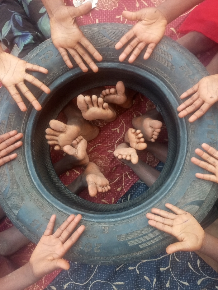 A group of children's hands frame a tire on a patterned surface. Inside the tire's circular space, numerous bare feet are visible. The contrast between the dark skin tones of the hands and feet and the bright soles is striking. The setting creates a sense of playfulness and camaraderie among the children.