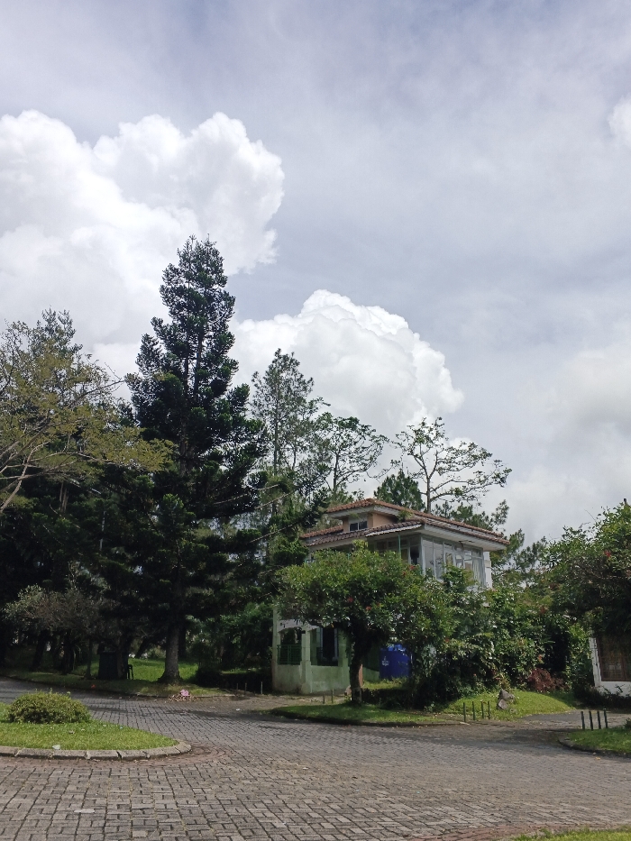 A building with a red tile roof is partially obscured by dense green trees. A tall evergreen tree dominates the left of the scene, rising toward a cloudy sky. The building's structure suggests a multi-level construction. A paved brick road leads towards the building, flanked by well-maintained green lawns. The day appears overcast, with soft light illuminating the landscape.