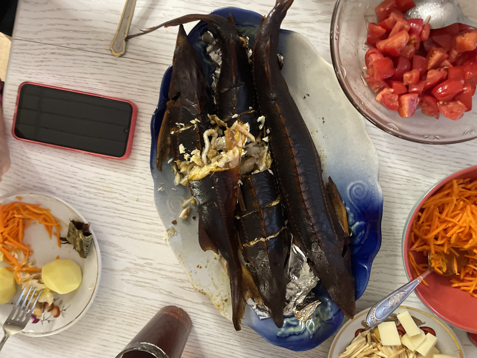 This image displays an overhead view of a dining table in Kozhino, Russia. Centrally located on a light-colored wooden table with visible grain, a large, irregularly shaped blue and white platter holds three whole, dark-skinned fish, consistent with smoked sturgeon or sterlet. One fish at the top is partially opened, revealing white, flaky flesh and bone, while another exhibits crumpled aluminum foil underneath. Surrounding the main platter, various dishes are present: * An off-white plate with a floral pattern contains two whole, peeled boiled potatoes and a portion of shredded orange carrots. A silver fork rests on this plate, with a person's hand partially visible near it. * A red bowl is filled with shredded orange carrots. * A clear glass bowl holds diced red tomatoes. * A smaller, round plate displays cubed light-colored cheese alongside thin, pale, elongated food items. A spoon with an ornate handle is positioned in this plate. * A clear glass containing a dark red beverage is situated to the left. A red-cased smartphone with a dark screen rests face down on the table to the upper right. A golden-colored utensil handle is partially visible at the far right. The arrangement suggests an active, informal communal dining setting.