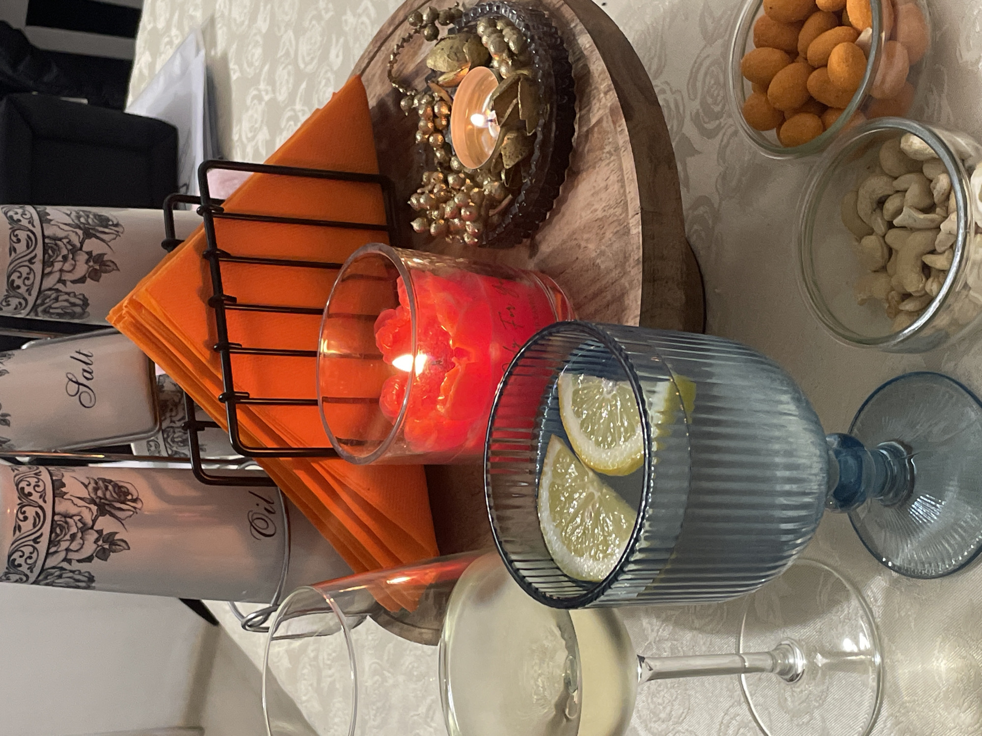 A still-life scene is arranged on a beige patterned tablecloth. Objects present include a metal rack holding orange napkins, two glass containers labeled "Salt" and "Oil" with floral decorations, a wooden platter holding a candle in a decorative holder, and a red candle in a glass jar. Two glass bowls containing nuts are also present. A blue-tinted glass filled with lemon slices and a clear wine glass containing a pale liquid are prominently displayed. The overall scene conveys a celebratory or festive atmosphere. This scene is highly unlikely to be geolocated to a specific place, like the city of Smolyan, Bulgaria, from the contents of the image alone.
