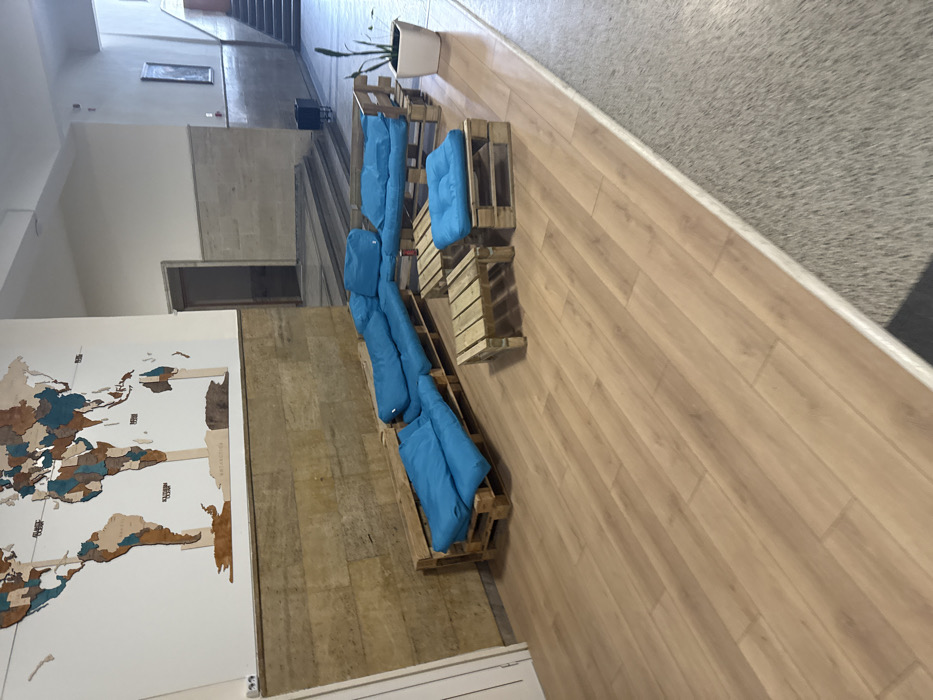 The scene depicts an unoccupied common area or lounge situated within a building in Varna, Bulgaria. The area features a distinct light wood-laminate flooring section, which transitions into a gray, textured concrete-like floor to the right. In the midground, an L-shaped sofa arrangement is constructed from wooden pallets, fitted with multiple bright turquoise blue cushions. One cushion on the longer section of the sofa is slightly dislodged. Two low, rectangular tables, also fashioned from wooden pallets, are positioned in front of the seating. A single red beverage can rests on one of these pallet tables. To the right of the seating area, a tall, slender green plant is contained within a white square pot. The wall behind the seating features a lower section covered with light brown, horizontally oriented stone-like tiling, topped by a plain white wall. A large, multi-piece wooden world map, depicting continents in various shades of brown and teal-blue, is affixed to the white wall. Visible labels include "ATLANTIC OCEAN," "AFRICA," "SOUTH AMERICA," and "ANTARCTICA." In the background, a dark doorway is visible on the left, set into a light-colored wall. To the right, a staircase with dark treads ascends, indicating multiple levels within the building. The overall lighting appears bright, originating from overhead sources not fully visible. No individuals are present in the scene, and no specific actions or interactions are occurring.