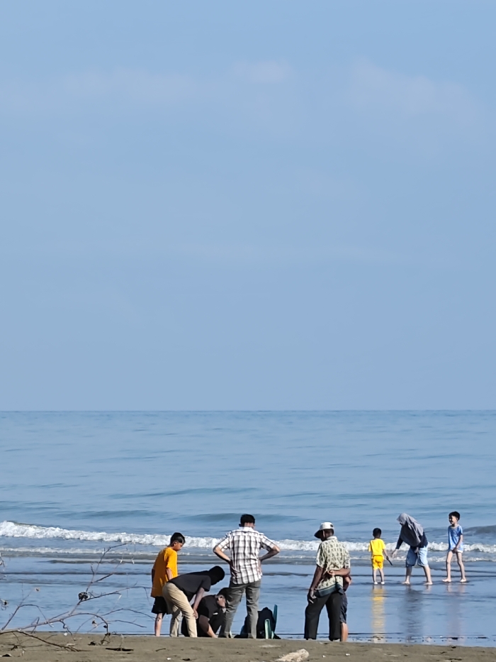 The image depicts a sunny beach scene in Reudeuep, Indonesia. A clear blue sky with minimal clouds occupies the upper portion, meeting a calm blue ocean with a distinct horizon line and gentle waves breaking near the shore. Nine individuals are present on the beach and in the shallow water. In the foreground, on the dry to wet sand, a group of six individuals is observed. From left to right: a young male in a yellow t-shirt stands facing the water; two males in dark shirts are bent over, appearing to interact with the wet sand, with a dark bag or object visible near their feet; a male in a light-colored plaid shirt stands with hands on hips, facing right; and an older male in a patterned shirt and light-colored hat stands facing the ocean with hands behind his back. Further right and slightly behind, in the shallow water, three additional individuals are visible: a small child in a bright yellow t-shirt and shorts; an adult, likely female, wearing a dark head covering (hijab), light-colored long-sleeved top, and light shorts, appearing to wade; and a young male in a blue t-shirt and light shorts, also wading. Dark, broken branches are scattered on the dry sand in the lower-left foreground.