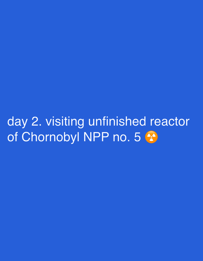 Text on a blue background reads "day 2. visiting unfinished reactor of Chornobyl NPP no. 5 ☢️". The emoji depicts a radioactive warning symbol. The text likely refers to a visit to an unfinished nuclear reactor at the Chernobyl Nuclear Power Plant (NPP), reactor number 5, on the second day of a trip or experience.
