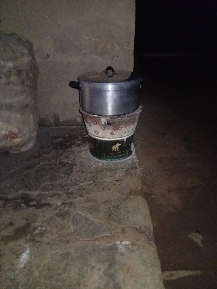 The scene depicts an outdoor or semi-enclosed area, likely at night or in low light, in the city of Unknown, Unknown. In the foreground, a large, lidded silver-colored metal pot rests on a charcoal or wood-burning stove. The stove consists of a dark green metal bucket or barrel, featuring a brown elephant logo, serving as a base, topped with a lighter-colored, possibly ceramic, grate unit with multiple ventilation holes. To the left, a large, translucent plastic bag, containing indistinct bulk material, leans against a light-colored concrete or stucco wall. The ground is a rough, uneven concrete or dirt surface, exhibiting scattered debris, moisture, and white residue. The area to the right and further into the background is dark and indistinct. No people are visible.