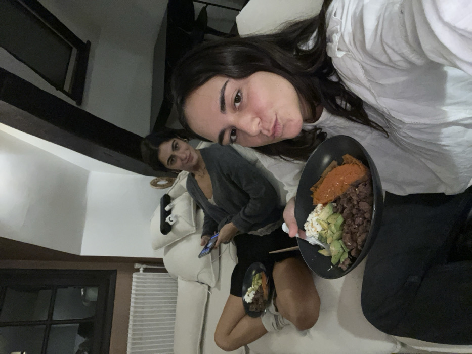 The image displays two young adult females inside an attic apartment, consistent with architectural styles found in Paris, France, characterized by visible dark wooden ceiling beams and a sloped ceiling with a skylight. The foreground subject, positioned on the right, has dark hair and wears a white long-sleeved shirt. She holds a dark bowl containing a meal of dark beans or lentils, cubed avocado, a white topping, and an orange purée, while making a puckered lip expression towards the camera. The background subject, seated on a white bed or lounge area on the left, has dark hair and wears a grey cardigan over a lighter top and dark shorts. She holds a dark smartphone in her left hand and looks towards the camera with a slight smile, with a smaller, similar bowl of food resting near her. The room features white walls, a dark multi-pane window with a white radiator below it on the left, and a dark minimalist table with chairs visible in the background on the right. The lighting is subdued, indicating evening conditions.