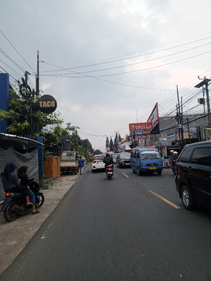 The scene is observed on a street in the city of Kheda, India, under an overcast sky. The asphalt road features a broken yellow line on its right side, indicating traffic flow away from the camera. On the left side of the road, an unpaved shoulder runs alongside a blue-painted building with an awning. A stack of red bricks is visible on this shoulder. Two females are seated on a black scooter parked on the unpaved surface; one wears a blue head covering, the other a brown head covering. Further down the left shoulder, a light-colored pickup truck is parked, and a male in a blue shirt walks away from the camera. A circular black sign with "TACO" written in white and orange is affixed to a utility pole on the left. Traffic on the road moves away from the camera. This includes a person riding a black scooter, followed by a white sedan, a dark-colored sedan, and a blue passenger van. A black SUV is partially visible in the right foreground, also heading away from the camera. On the right side of the street, commercial buildings display various signs, including a prominent red billboard with "TOKO CAHAYA BAJA" and "SUZUKI" text. Numerous overhead power and communication lines are strung across the entire upper portion of the frame, supported by multiple utility poles.