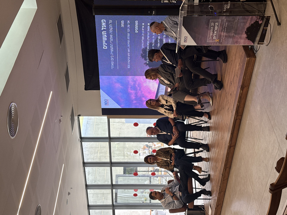 The image depicts an indoor panel discussion occurring on a raised wooden stage in Shaar HaNegev Regional Council, Israel