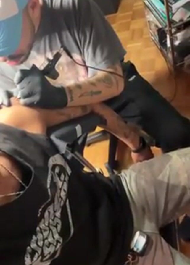 A video shows two people indoors. One person, wearing a gray t-shirt, black pants, and a blue and white baseball cap, is giving the other person a tattoo on their arm. The person receiving the tattoo is wearing a black t-shirt with a design on it and gray pants. The person giving the tattoo is wearing black gloves and has tattoos on their arm. The setting appears to be in a room with a wooden floor and a metal shelf with items on it in the background. The camera appears to be held by the person getting the tattoo.