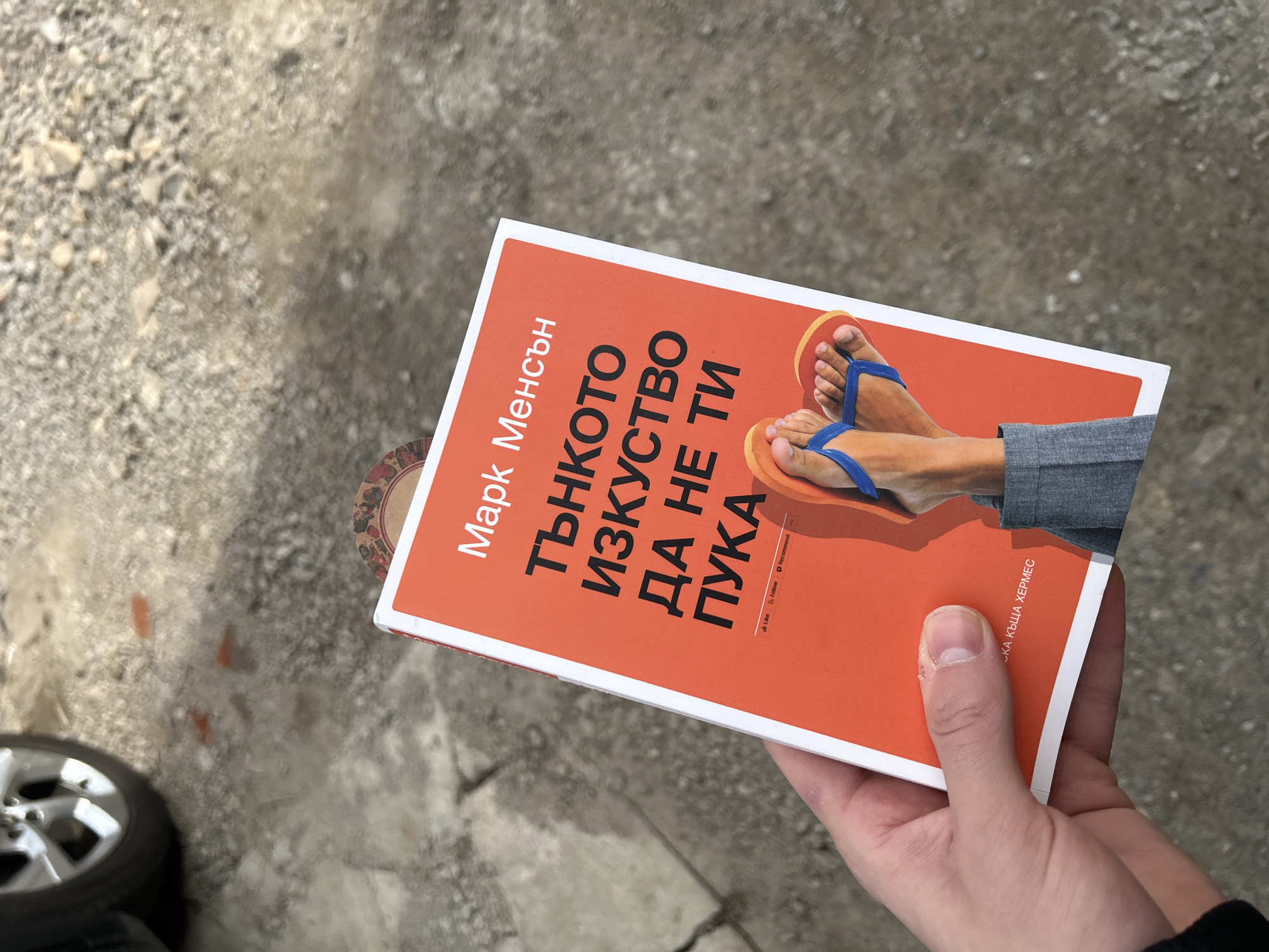 A person is holding an orange book titled "ТЪНКОТО ИЗКУСТВО ДА НЕ ТИ ПУКА" (The Subtle Art of Not Giving a F*ck) by Mark Manson in Sofia, Bulgaria. The book cover features a pair of feet wearing orange and blue flip-flops and gray pants. The surrounding environment consists of a concrete ground with gravel and a partially visible car wheel.
