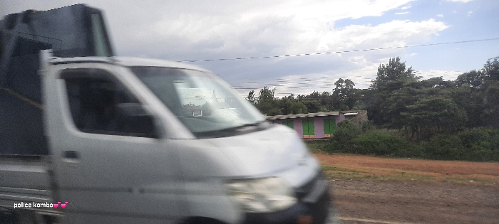 A blurry image shows a white truck with a dark container on its bed moving across a red dirt road. In the background, there are trees and small buildings with pink and green walls. A cloudy sky hangs overhead with telephone wires stretching across it. The words "police kombo" are written at the bottom left of the picture.