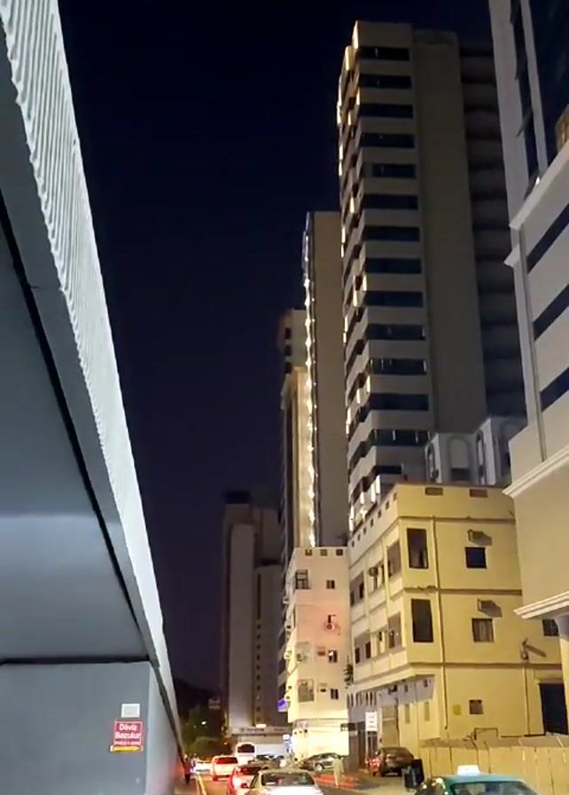street in a city at night. The camera is positioned beneath a grey overpass, looking down the road. Cars drive on the street, moving away from the camera's perspective. The road is lined with tall buildings, some are lit up. The sky is dark.