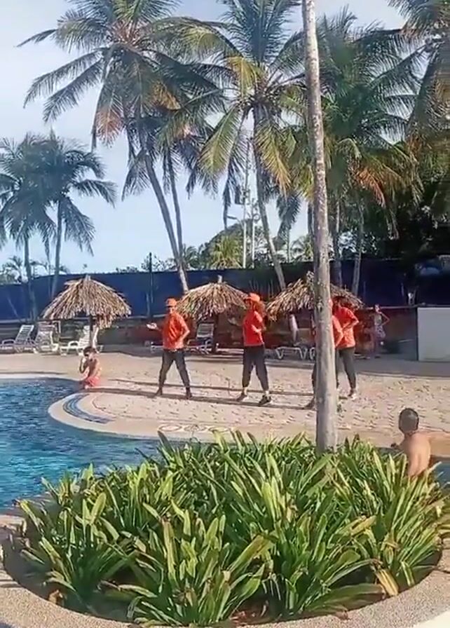 The scene is a tropical resort area with a swimming pool, palm trees, and several thatched-roof umbrellas. Four people in orange shirts are dancing on the pool deck. One person is swimming in the pool, and another is relaxing on the edge of the pool. The water is blue, and the sky is partly cloudy.