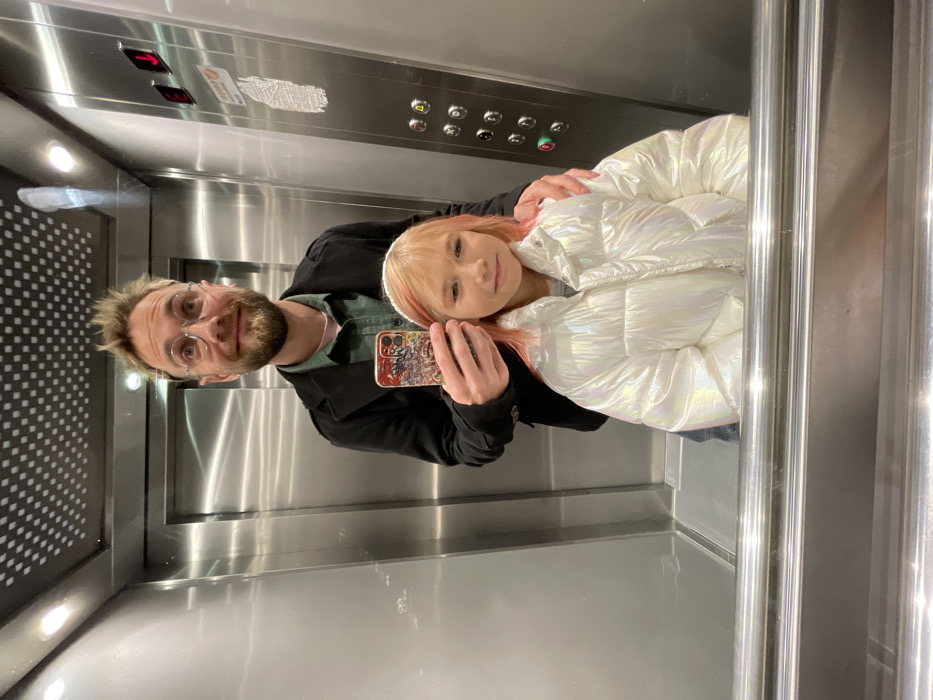 The image depicts two individuals, an adult male and a young girl, inside a polished stainless steel elevator in Budva, Montenegro