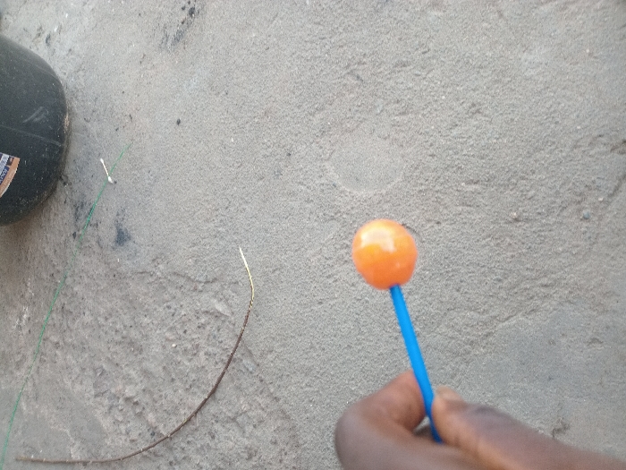 An elevated view captures a dark-skinned left hand holding an orange spherical lollipop on a blue plastic stick, positioned over a light gray, textured ground surface consistent with concrete or compacted soil. The hand is visible in the lower-left quadrant, with the lollipop held horizontally towards the center-left. In the upper-right quadrant, a portion of a black plastic bucket with some indistinct white labeling is present. A thin green line, possibly string or wire, extends horizontally across the upper-middle ground, passing beneath the bucket and secured by a small white object. A curved, thin, dark brown object, appearing to be a stem or wire, with a lighter-colored tip, rests on the ground in the upper-left quadrant. The scene is located in Zango-ndaji, Nigeria.