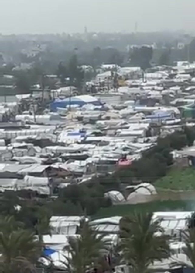 high-angle, overcast view of a dense refugee camp. Numerous white tents are packed closely together, interspersed with trees and some green areas. In the distance, faint buildings and structures are visible on the horizon. The overall atmosphere appears somber and crowded. There is no visible human activity.