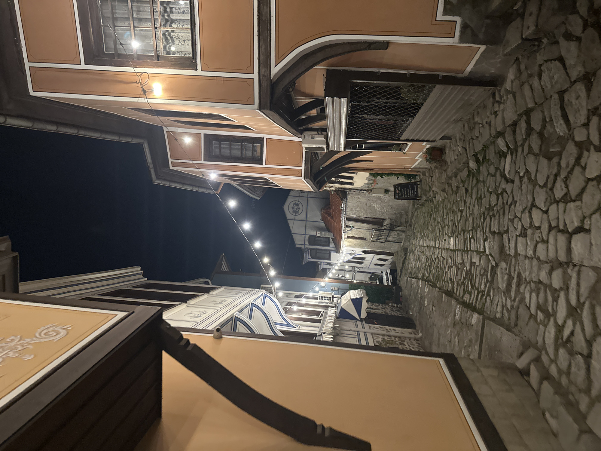 The image displays a narrow, ascending cobblestone street at night within the Old Town of Plovdiv, Bulgaria. Traditional Bulgarian Revival-style houses with overhanging upper floors and ornate facades line both sides of the thoroughfare. The buildings are predominantly painted in shades of light orange/ochre and white, accented with dark brown wooden elements and white trim; some feature blue and white geometric patterns. A string of illuminated globe lights is suspended across the street, providing primary illumination. Light also emanates from interior windows of some structures. On the left, a building presents a facade with a light orange base and an upper section detailed with white and blue geometric designs, below which a blue and white striped awning or umbrella is visible. A small white security camera is affixed to this building. The building on the right exhibits an orange facade with white borders and dark-framed windows, one of which has a visible patterned curtain. A metal mesh barrier covers a lower-level opening on the right side. Further down the street, an A-frame chalkboard sign is visible on the right, and a small white vehicle is parked near the end of the discernible street section. No individuals are present in the scene. The sky above is dark.