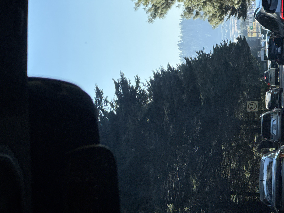 A view from inside a vehicle shows a bright sky above a dense line of tall, dark green trees. To the right of the trees, a line of vehicles appears to be in a traffic jam, with a speed limit sign (80) visible amongst them. A portion of the car's interior, including part of a seat, is visible in the left foreground. The scene suggests a roadside view while stuck in traffic.