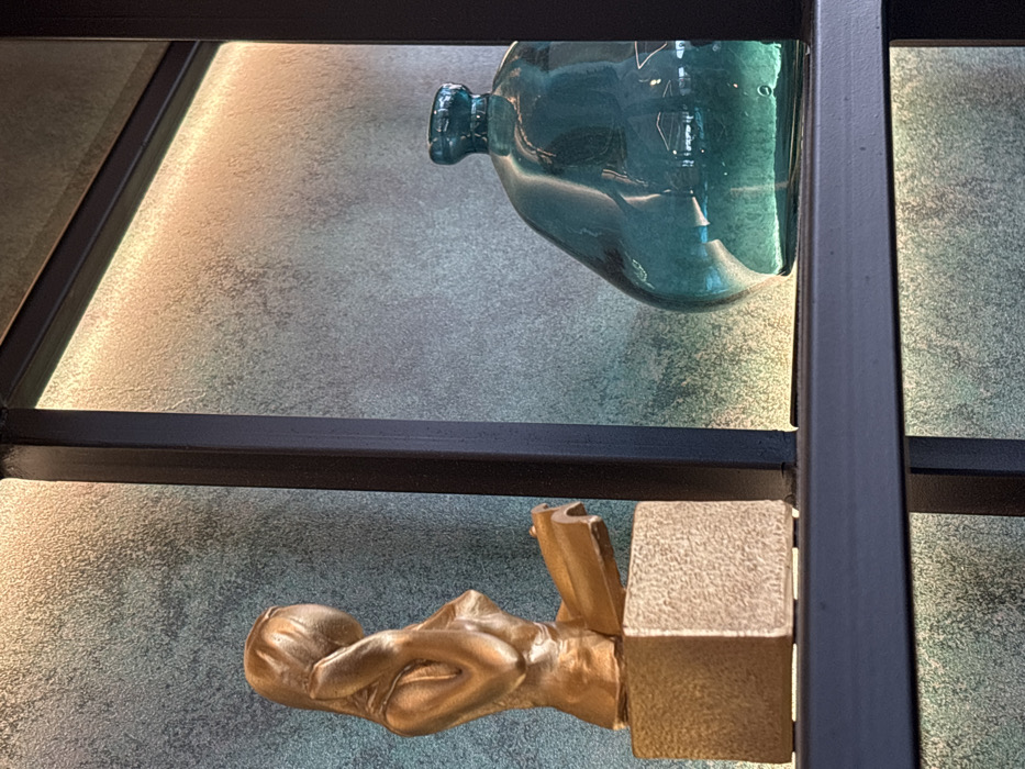 This interior scene, located in Ulcinj - Ulqin, Montenegro, displays two decorative objects on a dark shelving unit against a textured, teal-green background