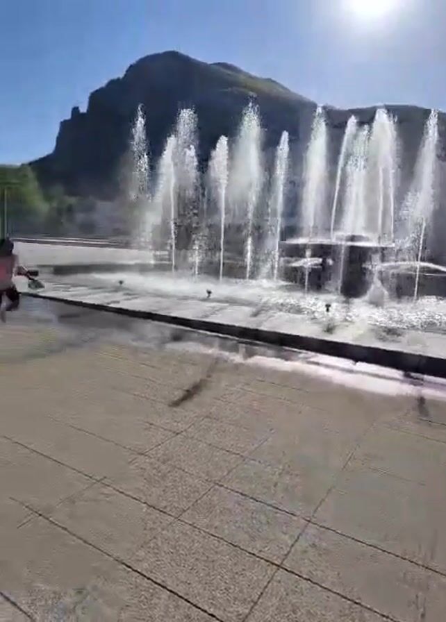 Two children are running near a large fountain on a sunny day. The fountain is multi-tiered and shooting water high into the air. A mountain can be seen in the background under a clear blue sky. The children are running and seem to be playing in the water. The surface they are running on is paved with square stones. The sun is shining brightly, creating shadows of the children.
