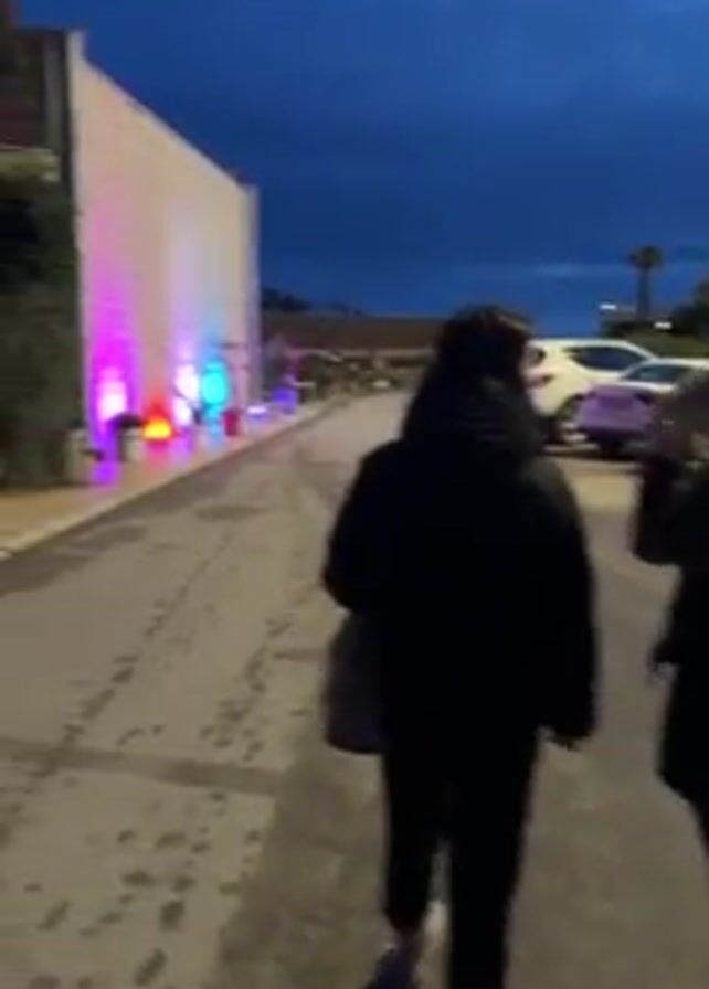 Two women walk away from the camera on a paved driveway at dusk. There is a light-colored building to the left with colored lights shining on it. There are cars parked to the right. Further ahead is a stone wall with plants and colored lights. The camera pans left to view stone stairs with blue lights.