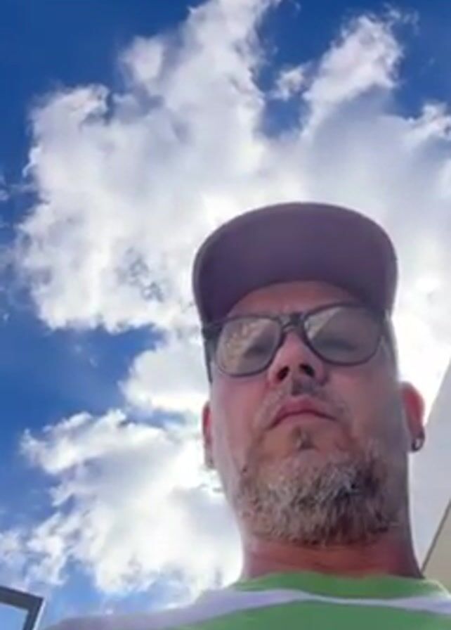 A low-angle shot shows a man wearing a purple cap, glasses, and a green and white striped shirt. He has a salt-and-pepper beard. He lifts his hand to adjust his cap. The background shows a blue sky with fluffy white clouds. Part of a white building is visible on the right side of the frame.