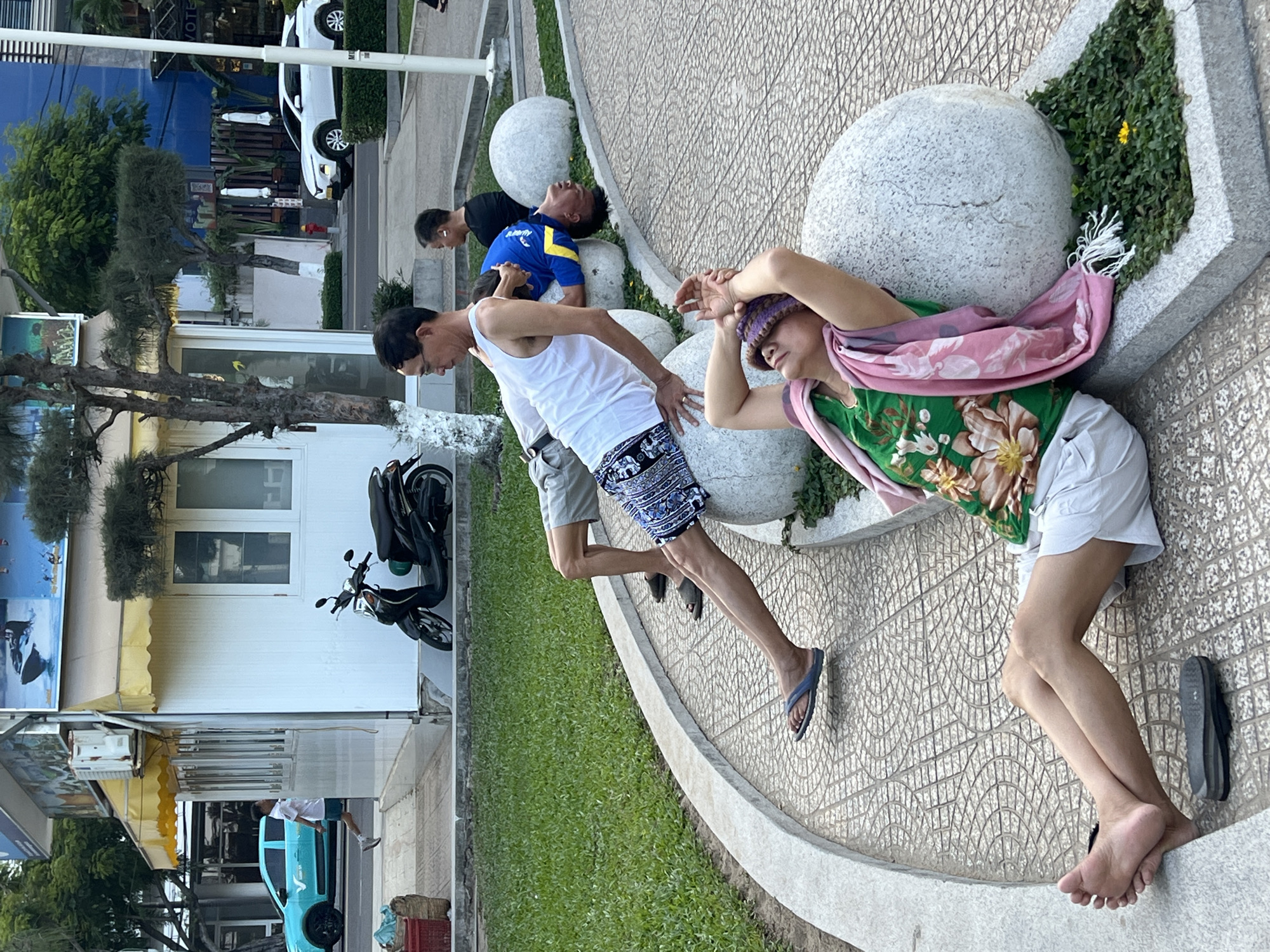 In Nha Trang, Vietnam, the photograph shows four people near a building and adjacent streetscape. A man in a white tank top and patterned shorts, wearing blue flip-flops, stands close to a large, gray stone sphere. Another person stands next to him, wearing gray shorts. A woman is positioned closer to another gray stone sphere and wears a green floral-patterned top, a pink scarf, a purple head covering, and white shorts. Her feet are bare, and a gray shoe lies nearby. Her hands are raised toward her face. A fourth man is lying down, dressed in a blue shirt, with a black shirt-wearing person beside him, near a third sphere. The scene includes a gray paved area, a grassy section, and an elevated stone edge. The building behind them is white with a yellow awning. A black motorcycle is parked beside the building. Further away, a blue car and a white car are visible.