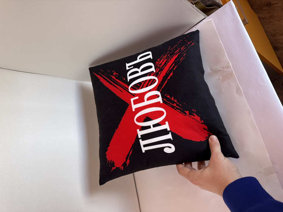 A black square pillow is depicted in an indoor environment in Unknown, Bulgaria. The pillow features a large, distressed red 'X' graphic, over which the white Cyrillic word 'ЛЮБОВЬ' (LOVE) is printed. A human left hand, clad in a blue long-sleeved garment, holds the pillow by its lower-left corner. The pillow rests upon a white horizontal surface, which displays minor irregularities and adhesive residue. The background consists of a plain white wall forming an interior corner on the left, and a segment of a yellow cabinet or furniture item partially visible beneath the white surface on the right. The scene is evenly lit.