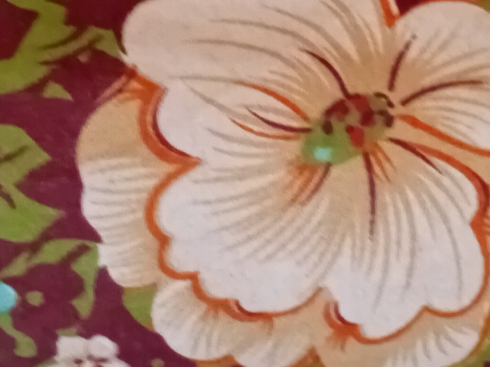 close-up of a stylized floral design. A large, off-white flower with delicate lines mimicking petal veins dominates the scene. The petals are outlined in a muted orange hue. In the center, a mix of red and green creates the flower's reproductive parts. The background is a blend of dark maroon and green, featuring additional stylized plant shapes. The overall impression is of a decorative, possibly vintage, pattern.