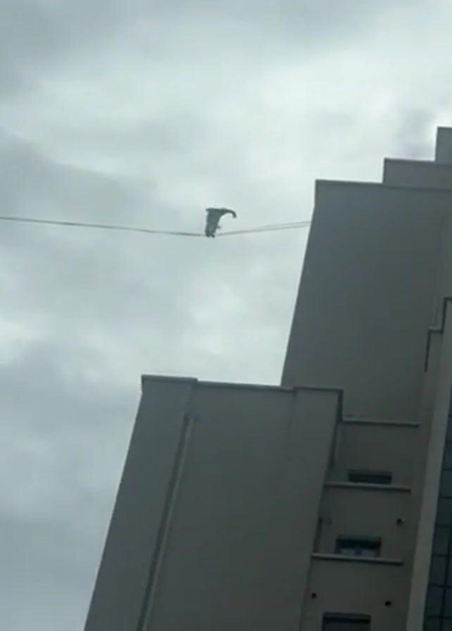 A man is walking on a wire strung between two buildings. The buildings are tall and appear to be in an urban environment. The sky is overcast and gray. The man is walking slowly and carefully, balancing as he goes. A person films from the ground, while speaking Portuguese.