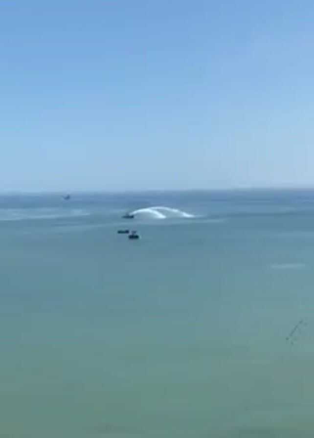 wide, calm, turquoise ocean under a clear blue sky. Several boats are visible on the water's surface. One boat is actively spraying a large, white plume of water into the air, creating a fan-like spray effect. Other boats are stationary nearby. The shoreline is visible at the bottom of the frame, with indistinct figures possibly present.