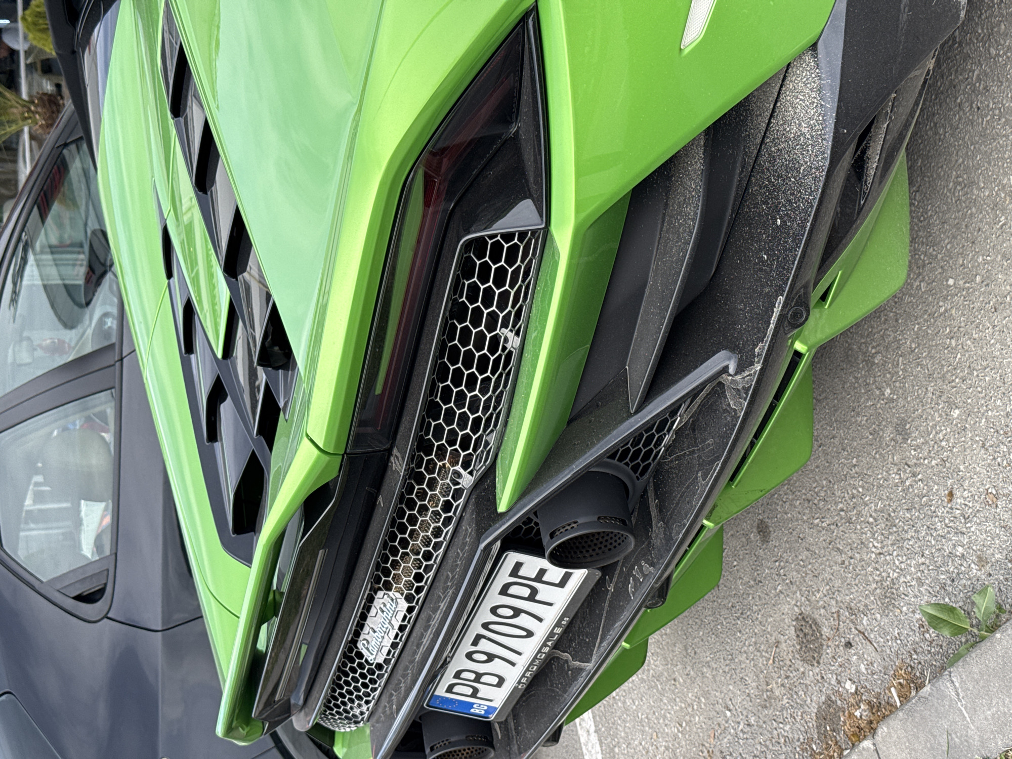 The image depicts the rear of a bright green Lamborghini, likely a Huracán model, in Plovdiv, Bulgaria. The car is parked on asphalt near a curb with some minor plant growth. The license plate reads "PB 9709 PE" and displays the "BG" designation for Bulgaria. The rear of another vehicle, possibly a dark-colored car or SUV, is partially visible on the left side of the frame. The Lamborghini is covered in a light layer of dust. The Lamborghini logo is visible on the grille.