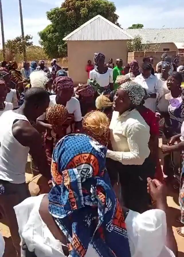 A large group of people, mainly women, are gathered outdoors on a sunny day. They are clustered in a loose circle on a dusty, reddish-brown ground. Most of the women are wearing colorful patterned headscarves and a mix of light-colored tops and dark skirts or dresses. Several people, including at least one man in a white tank top, are holding and playing drums. The women appear to be singing and dancing together. Behind the group is a simple, light-colored building with a white roof. There is also some greenery visible, including a tree and some smaller plants. The overall impression is one of a festive gathering, possibly a celebration or communal activity.