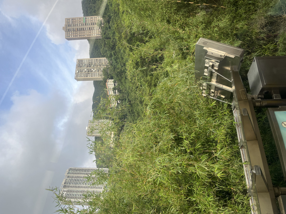 The image displays a densely vegetated, steep hillside on Hong Kong Island, China, characteristic of the ascent towards Victoria Peak. In the lower portion and foreground, lush green bamboo foliage dominates, partially obscuring a silver-grey metallic mechanical structure consistent with a tramway or funicular system, featuring a horizontal rail and an angled, rectangular component on the right. In the midground, several residential buildings are integrated into the verdant slopes. On the far left, a modern, light-colored high-rise apartment building is visible. Towards the center and right, two older, light brown high-rise buildings stand, with one on the far right exhibiting a green tarp on an upper floor. Below these high-rises, a cluster of lower-rise residential complexes with terracotta roofs is discernible. The upper sky is partially cloudy with patches of blue and faint white contrails. No individuals, actions, or direct interactions are depicted in the static scene.