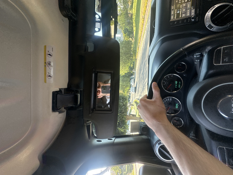interior of a Jeep, focusing on the driver's side. A hand grips the steering wheel, with the dashboard visible behind it. The speedometer reads 6046, and the fuel gauge shows a level above empty. To the left, a sun visor is extended, reflecting a person holding a phone. Outside the window, trees line a street with parked cars. The radio display shows modes like HDD, DISC, AUX, and iPhone Memo, along with a time of 4:33.