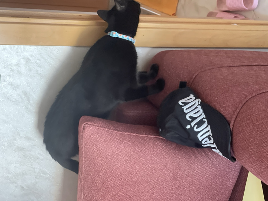 This image captures an indoor domestic scene in Mohammedia, Morocco. A sleek black cat, wearing a light blue and orange patterned collar, is positioned atop the backrest of a reddish-pink upholstered sofa. Its body is mostly visible, with its hindquarters on the left and its head turned towards the right, looking out of frame. Below the cat, resting on the sofa's backrest, is a black baseball cap with "Balenciaga" written in white lettering across its front. To the right of the sofa and the cat, a light-colored wooden door frame is visible. The background consists of a textured, light-colored wall. On the floor, beyond the door frame, a pair of pink slide-style slippers are present next to a light orange object. No people are visible. The cat's action appears to be observing its surroundings from an elevated position.