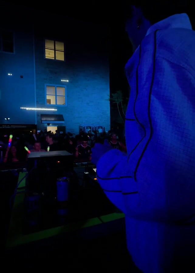 DJ performing at an outdoor event at night. The DJ is standing behind a DJ setup with mixers and turntables. They are wearing a light-colored jacket with dark trim. In front of the DJ is a crowd of people, some holding light-up sticks. The event is taking place in an outdoor space next to a building with lit windows. The lighting is mostly blue and pink, creating a party atmosphere.