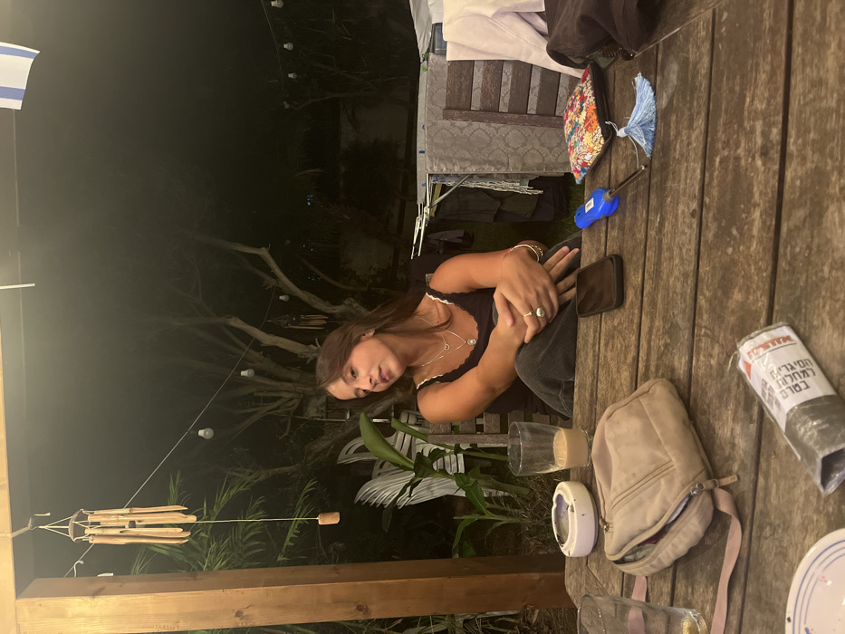 The scene depicts a nighttime outdoor setting, identified as a backyard or patio in Kadima-Zoran, Israel. A young adult female with brown hair, wearing a dark sleeveless top with white trim, dark pants, and multiple pieces of jewelry (necklaces, rings, bracelets), is seated at a wooden table. Her arms are crossed, and she is looking slightly to her left. On the wooden table, various items are present: a partial view of a white plate with blue speckles, a grey cylindrical object wrapped in clear plastic with Hebrew text (partially visible, including "הכי גדול" - "the biggest"), a beige cross-body bag, a clear glass containing a light brown liquid, a white ceramic ashtray with cigarette butts, a dark-colored smartphone placed screen-down, a blue long-reach lighter, a small, colorful embroidered pouch with a light blue tassel, and a dark fabric bag. In the background, dense foliage and trees are visible under artificial illumination from string lights. A clothes drying rack with laundry hangs to the right, and stacked white plastic chairs are visible in the mid-ground. Overhead, a wooden pergola structure supports a bamboo wind chime and an Israeli flag.
