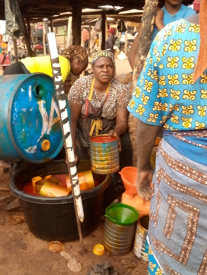A woman in a leopard-print blouse holds a can above a black tub filled with reddish liquid and other cans. Beside her is a blue barrel and a pole with white tape. Another woman in yellow stands nearby, while a person in blue patterned clothing stands in the foreground. Funnels and more cans are scattered around the base of the tub. The setting appears to be an outdoor market with a makeshift structure providing cover overhead.