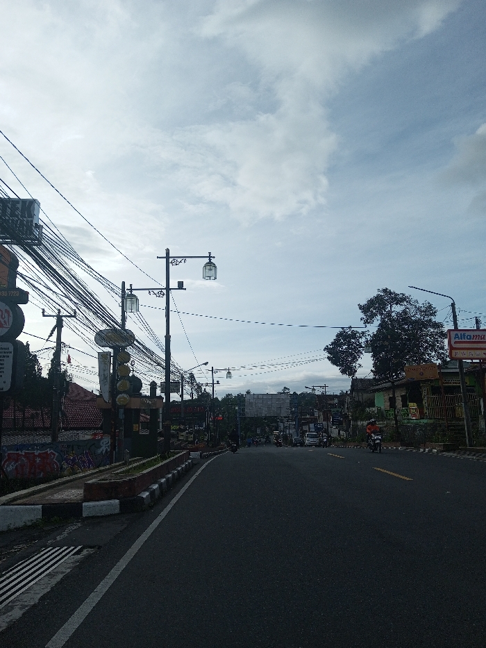 A street stretches into the distance under a cloudy sky. Buildings line the sides of the road, including a shop with an "Alfamart" sign. Power lines crisscross overhead, suspended from multiple utility poles adorned with decorative cage-like lanterns. Motorbikes travel on the road. A concrete barrier with alternating black and white blocks runs along the left side of the road, with graffiti visible on the adjacent wall.