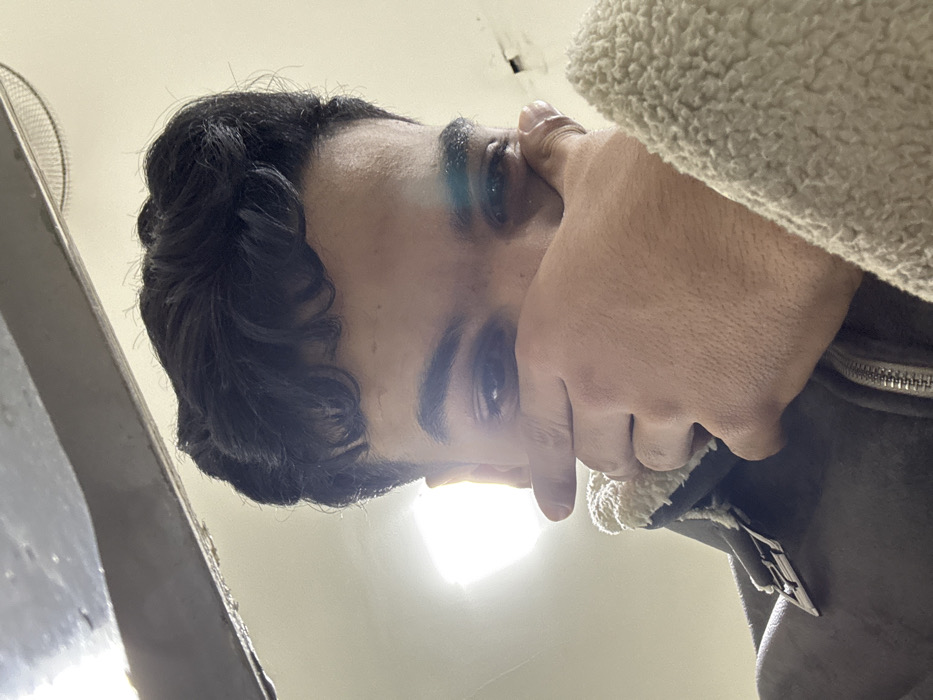 A close-up photograph taken from a low angle depicts a male individual indoors in Fez, Morocco. The subject has dark, curly hair and prominent eyebrows. His right hand is positioned across the lower half of his face, covering the mouth and chin. He is wearing a dark jacket with a visible silver zipper and a cream-colored fleece lining around the collar area and right arm. His eyes are open and directed towards the camera. A bright light source is prominently visible in the upper left background, casting a significant lens flare across the image, particularly over the subject's left eye. The background is otherwise indistinct, appearing as light-colored surfaces, with a dark, linear overhead structure visible at the top edge of the frame. A faint circular grate pattern is partially visible in the upper right background, suggesting a fan or vent.