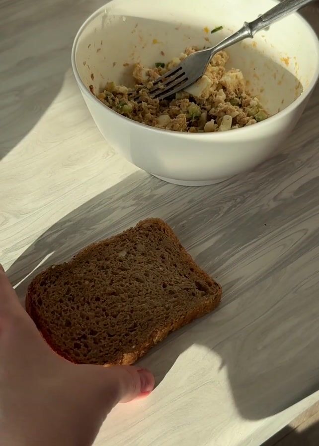 person making a sandwich. A single slice of brown bread is placed on a light grey wood-grain surface next to a white bowl containing a tuna salad mix. A fork is in the bowl. The person picks up the slice of bread and uses the fork to spoon a portion of the tuna salad mix onto the bread. Sunlight streams across the scene. The person has a bracelet on their wrist. A plastic bag filled with more bread sits in the background.