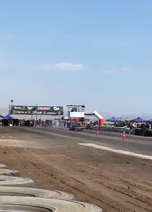two cars doing a burnout before a drag race on a sunny day. The drag strip has a starting line with a tower and an archway, and a crowd of people is gathered on both sides of the track behind tents and other vehicles. The camera is behind a barrier of tires, and the background is a desert landscape. The cars are both compact, modified vehicles. The first is teal and black and the second is red and black.