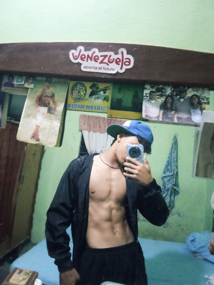 The image depicts a male individual, likely a teenager or young adult, taking a mirror selfie in what appears to be a bedroom in Juan Griego, Venezuela