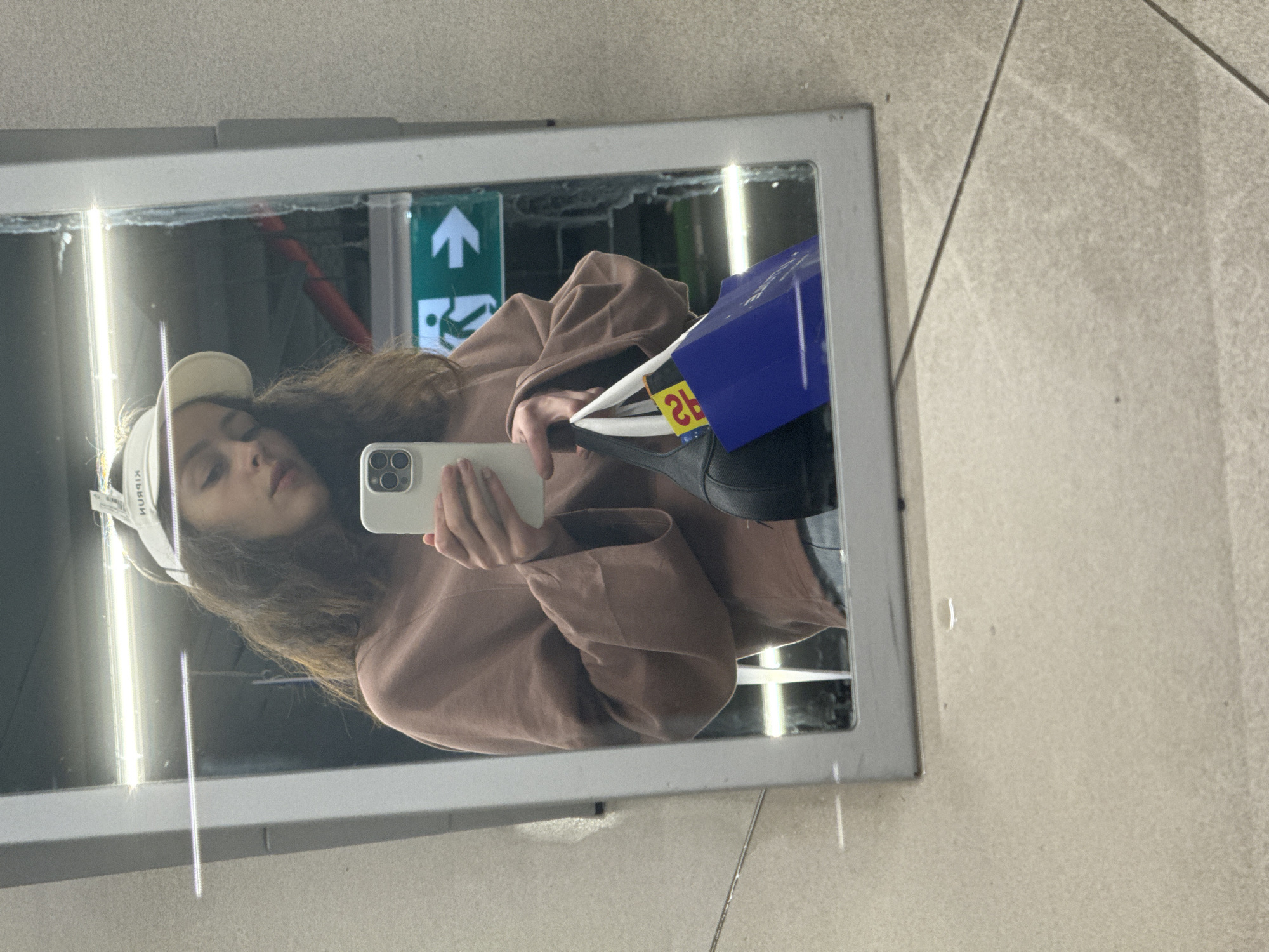 The image presents a mirror selfie taken by a female in an indoor environment, located in the city of Al Jimi, United Arab Emirates. The reflection displays a young adult female with dark, wavy hair, wearing a light-colored visor with reversed text, a long-sleeved dusty pink or light brown top, and light blue jeans. She holds a light-colored smartphone in her right hand, positioned for the reflection. Her left hand holds a black tote bag which contains a blue shopping bag and a yellow item displaying reversed characters "2E". The mirror itself has a light grey frame. The reflected background includes a ceiling with a bright linear light fixture and, to the right of the female's reflection, a green emergency exit sign with a white running figure and a right-pointing arrow. The wall surrounding the mirror and the floor visible beneath it are constructed from light-colored, textured tiles.